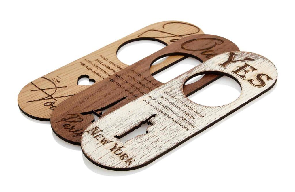 Türhänger aus Holz für Hotels. In verschiedenen Farben erhältlich. Individuell gestaltbar. Preis exklusive Lasergravur.