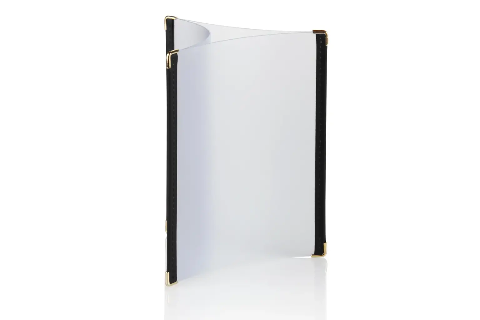 Tischaufsteller Triangel, ein Transparenter, 3-seitiger Folienaufsteller. Mit schwarzem Gelenksband abgenäht. Schutzecken in Gold. Bestellmenge ausschließlich 7 Stück.
